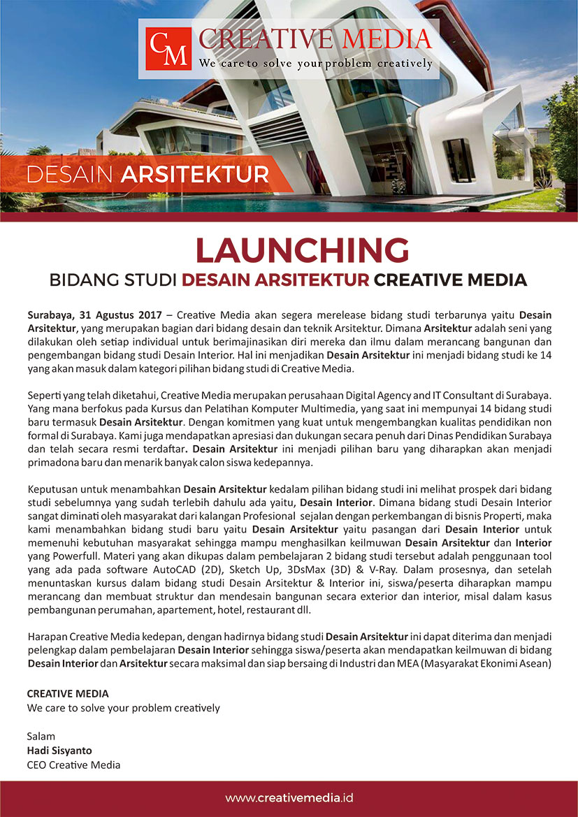 Creative Media membuka bidang studi baru yang merupakan bagian dari bidang desain dan teknik arsitektur yaitu Desain Arsitektur. Dimana Arsitektur adalah seni yang dilakukan oleh setiap individual untuk berimajinasikan diri mereka dan ilmu dalam merancang bangunan. Dalam artian yang lebih luas, arsitektur mencakup merancang dan membangun keseluruhan lingkungan binaan, mulai dari level makro yaitu perencanaan kota, perancangan perkotaan, arsitektur lanskap, hingga ke level mikro yaitu desain bangunan, desain perabot dan desain produk. Arsitektur juga merujuk kepada hasil-hasil proses perancangan tersebut.