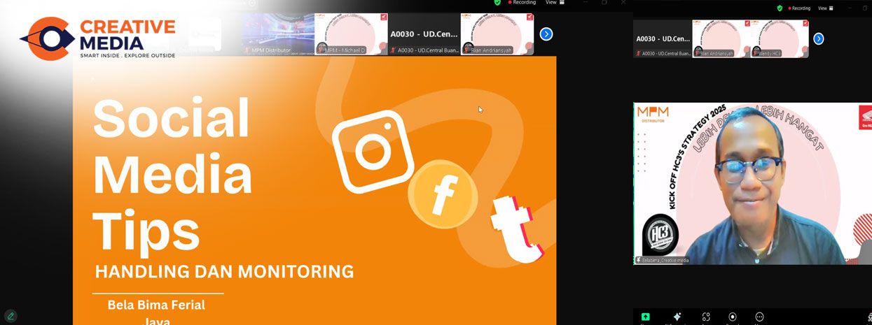 Layanan pelanggan melalui media sosial menjadi elemen penting dalam meningkatkan kepuasan dan loyalitas pelanggan di era digital saat ini. Memahami hal tersebut, MPM Honda bekerja sama dengan Creative Media dalam mengadakan Workshop Customer Handling Digital pada 19 Februari 2025. Kegiatan ini diselenggarakan secara online melalui Zoom Meeting dan diikuti oleh 400 peserta, termasuk Kepala Cabang, Koordinator Wilayah (Korwil), serta Admin HC3 dealer dari Jawa Timur dan Nusa Tenggara Barat (NTB).