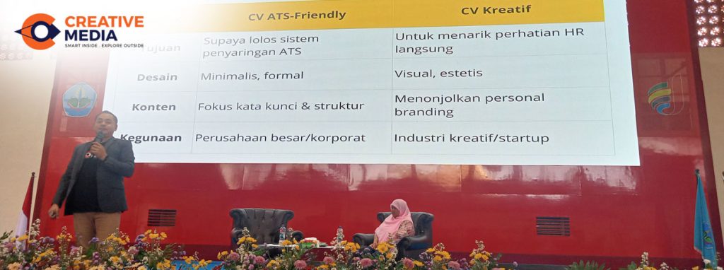 Salah satu sesi unggulan dari kegiatan ini adalah Workshop Portofolio Digital yang menggandeng Creative Media sebagai tamu sekaligus Narasumber. Creative Media dikenal sebagai lembaga pelatihan profesional di bidang IT & Multimedia, yang berfokus pada keterampilan digital. Dengan mengusung tema “Mulai Karirmu di Sini”, workshop ini bertujuan memberikan bekal keterampilan dan wawasan kepada mahasiswa serta alumni agar mampu menghadapi dunia kerja dengan percaya diri dan strategi yang tepat.