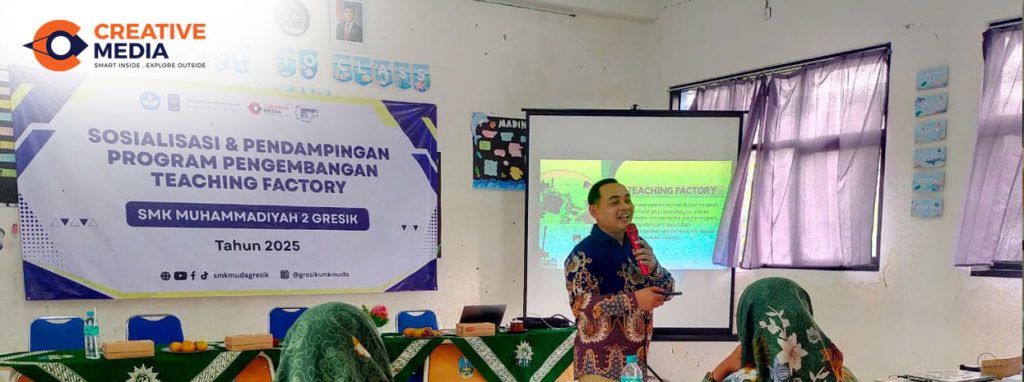 SMK Muhammadiyah 2 Gresik memiliki konsentrasi keahlian Desain Komunikasi Visual (DKV). Bidang ini sangat relevan dengan usaha Creative Media. Pada workshop ini, Creative Media memberikan gambaran nyata bagaimana Teaching Factory dapat diterapkan di jurusan DKV. Para guru dibekali wawasan praktis terkait langkah-langkah pengembangan produk dan jasa kreatif. Selain itu, Creative Media juga menekankan pentingnya analisis SDM agar Teaching Factory berjalan efektif. Tidak hanya itu, sesi diskusi interaktif membuka ruang bagi guru untuk bertanya langsung mengenai tantangan dan peluang dalam mengelola TeFa, khususnya di bidang desain komunikasi visual.